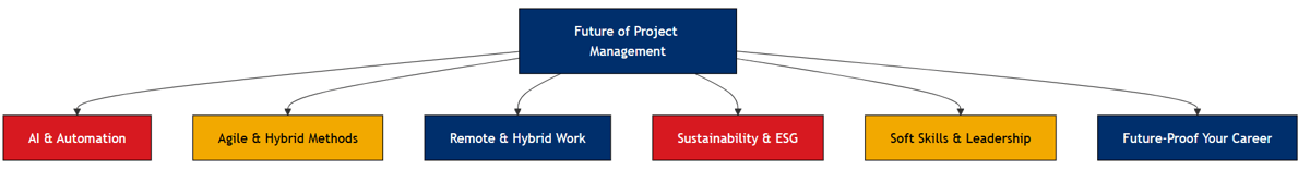 This simplified Mermaid chart visually represents the future of project management by highlighting five key trends shaping the industry: